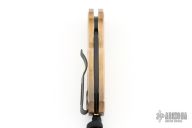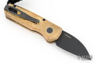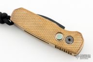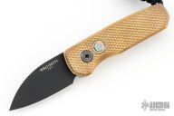 This Runt by Pro-Tech features a black 20cv blade.  The handle features a textured bronze aluminum frame with milled thumbrest, a stainless steel tip up pocket clip and a pearl push button.  Comes with original box and papers. Excellent Condition.