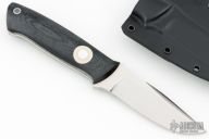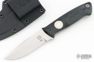 This knife by Dozier Knives features a satin finished blade, .168" blade stock and .970" blade depth, full tang construction. The handle has black linen micarta scales with white paper micarta insert, aluminum pins and lanyard hole. Comes with kydex sheath with belt clip. New from maker.