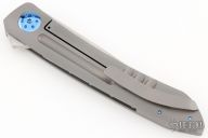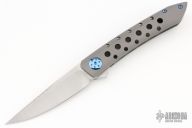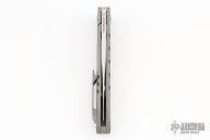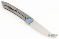 This model of the Alliance Designs Kevin Foster Anchovy features a gray blasted titanium handle with a hole pattern and blue anodized hardware. Alliance Designs has teamed up with knife maker Kevin Foster to create the Anchovy, a flipper knife that is based on his custom model of the same name. It features a satin finished blade made from RWL-34 stainless steel. This slim EDC knife sports an over-sized titanium pivot with matching body screws. The pocket clip is set for tip-up, right hand carry. Features: Hollow ground RWL-34 stainless steel blade provides excellent edge retention and slicing abilities. Smooth contoured titanium handle is comfortable in hand. Item includes a titanium pocket clip with hidden screws to keep a clean aesthetic. Has some marks and spotting on the blade. Has a couple light scratches on the frame. Great condition otherwise.