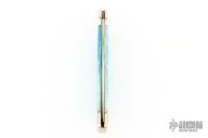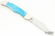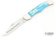 This knife by Case Knives features a mirror polished blade with nail nick. The handle has polished steel bolsters, blue appaloosa bone covers, brass liners and stainless steel spring. Comes with original box and papers. Excellent condition.
