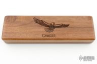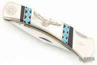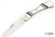 This Lockback by Camillus Knives features a satin finished clip point blade with a single nail nick.  The handle has nickel silver integral bolsters/liners, mother-of-pearl covers and a stainless backspring.  Stone inlays.  Includes a wooden display case.  Excellent Condition.