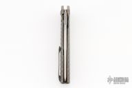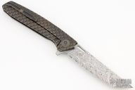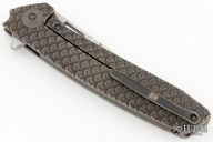 This 604DST by WE Knives has a Damasteel tanto blade with notched thumbrest and flipper. The handle is comprised of an anodized "Scale" machined titanium frame with titanium tip up clip. Nice blade seating, detent and lock up. Includes COA, disassembly tool and original box. #63of80. Excellent condition.