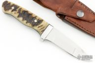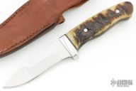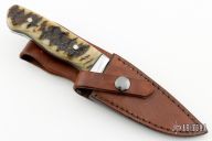 This knife by Jim Ort features a mirror polished duplex ground blade with tapered tang construction, .170" blade stock and 1.073" blade depth. The handle features a stainless steel guard with rams horn scales and black liners. Includes a brown leather sheath. Has a couple light scratches, otherwise excellent condition.