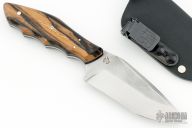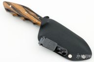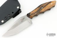 This knife was hand forged by Taylor Shields, one of Murray Carter's apprentices, has a Hitachi White #1 steel core San Mai blade laminated with 410 stainless steel, .162" blade thickness and 1.431" blade depth, full tapered tang construction. The handle has stabilized spalted wood scales, copper and black G-10 liners. Very nice work. Comes with kydex sheath. Has a couple light scratches,otherwise excellent condition.