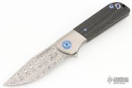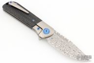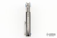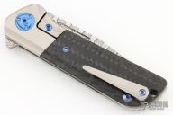 Not to be outdone by the blade, Liong's created a very aesthetically pleasing handle that is a first for the Reate/Mah collaborations...a bolster lock. This style gives you the best of both worlds; a nice thick lock with a replaceable lockbar insert/overtravel arrestor and the matching handle scale look of a bolstered design. And there's just something about playing with a bolster lock, it's just so much more fun than a traditional frame lock. This beauty is outfitted with bronze anodized titanium hardware, a wired wheel finished titanium frame, backspacer and clip, and carbon fiber scales. The flipping action is out of this world and the design is both good looking and highly ergonomic...we absolutely love this knife!