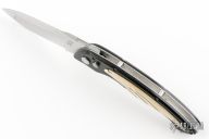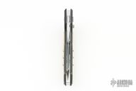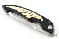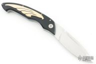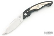 This auto by Terry Renner was made for the 2010 Sarasota Knife Club and is #18 of 25. It features a multi-ground satin finished blade. The handle has black G-10 scales with carved mammoth ivory overlays, aluminum liners. Nice strong action. Has some light staining and scratches on the blade, otherwise good condition.