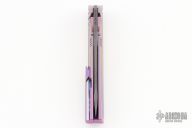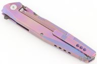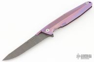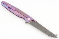 This 1507 flipper by Rike Knife features a Damascus blade with dual anodized titanium thumbstuds and a notched flipper, has a dimpled thumbrest. The handle has a milled and anodized titanium frame with matching backspacer and tip up clip, stainless lockface insert. Rides on bearings, nice detent, lockup and blade seating. Excellent Condition. Comes with original zippered case.