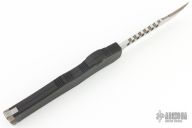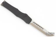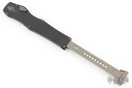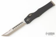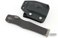 This Signature Series Halo VI features a bronzed Hellhound tanto blade with satin flats, fullers and notched spine. Its handle is made from black Mil-Spec anodized alloy with bronzed hardware. The charging handle comes marked with the Microtech logo and date of creation along with the serial number. Microtech's Halo VI sets itself apart from previous models with added safety features and an improved charging handle mechanism. . Its upgraded charging handle is built with dual pivoting latches that create a secure seal in the closed position. Comes with original box, kydex sheath and papers. Dated 9/2018. Excellent condition.