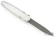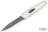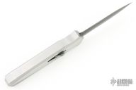 This Triton OTF Auto by Jeffrey Harkins features a Damascus double edged blade. The handle has a two tone 416 stainless steel frame with bead blast finished bevels and millings. Satin flats. Excellent work. Comes with a hard case. Has a couple very light scratches, otherwise excellent condition.