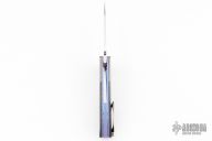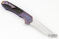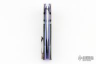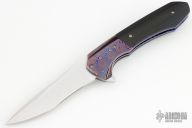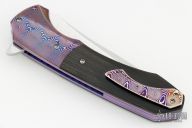 This Axis linerlock flipper by William Tuch features a Polished Damascus recurve blade with flipper. The handle has Damascus bolsters, carbon fiber scales, anodized and textured titanium backspacer and liners with jeweled interiors, Damascus 3.8tip up clip. Rides on bearings, nice detent, lockup and blade seating. Comes with a zippered case. Excellent condition.