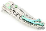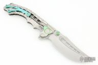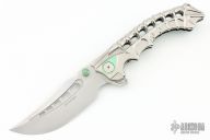 This stunning folder from South African maker Andre de Villiers is a great example of art and function. The Scavenger's trailing point blade is M390 and the handle a skeleton titanium with matching titanium clip. Sports both thumb studs and large skeletonized flipper. The action is smooth, lockup is secure, the feel is light and agile. Condition is excellent. Comes with a zippered case.