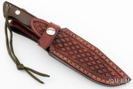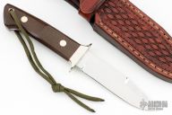This Loveless Style Chute Knife by JP Jones features a mirror polished blade with false top edge, .177" blade stock and 1.008" blade depth. The handle is comprised of a stainless steel guard and green canvas micarta scales over red fiber liners and full tapered tang construction. Lanyard tube in pommel. Includes a hand tooled brown leather sheath with belt loop. Excellent condition. Comes with COA