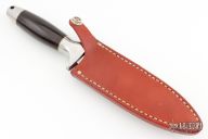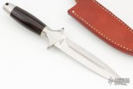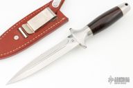 This Trooper by Kershaw Knives is a mirror polished double-edged dagger with fullers, .215" blade stock and .937" blade depth, hidden tang construction. The handle has a stainless steel guard and butt with wood grip and brass spacers, lanyard hole at the butt. Comes with a brown  leather sheath, original box and papers dated 8/88 and S/N 16616.  Excellent Condition.