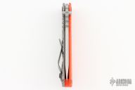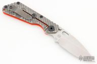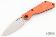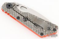 This SNG DGG by Strider has a stonewash spear point blade with dual thumbstuds, thumbhole, and a notched thumbrest. The handle is orange G-10 and bead blasted titanium "Gunner Grip", lockbar stabilizer, and stonewash finish titanium tip up clip. Nice detent, lockup and blade seating. Excellent Condition.