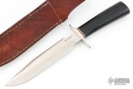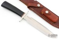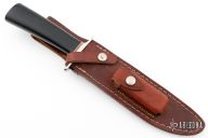 This R1 Military Classic by Cold Steel features a satin finished blade with sharpened top edge, .209" blade stock and 1.213" blade depth, hidden tang construction. The handle has a stainless steel guard, red white and black spacers and black linen micarta grip. Includes brown leather sheath with belt loop and sharpening stone. Has a few light scratches, excellent condition.