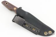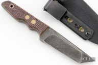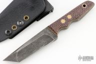 This knife by A2D Mercantile features an acid tumble finished blade with a full tang construction.  .291" Blade Stock.  .985" Blade Depth.  The handle has burlap micarta scales over brass liners. Comes with a kydex sheath. Light sheathing marks are visible on the blade otherwise the knife is in Excellent condition.