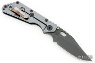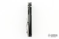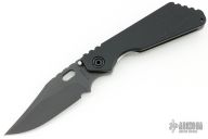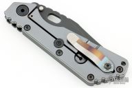 This Mick Strider SMF Bowie framelock folder features a black blade with thumbhole and notched thumbrest. The handle has a black aluminum and an anodized titanium frame with titanium clip, tip up carry, lockbar stabilizer. Jimping on blade spine. Nice lockup, detent, and blade seating. New condition. This knife came to us on consignment.