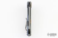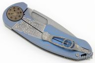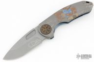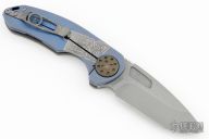 This F3 by Curtiss Knives features a two-tone stonewashed blade with notched thumbrest and flipper. The handle has a tumbled titanium frame with laser engraving and a matching tip up titanium clip. Satin stainless hardware. Rides on bearings, nice detent and lockup. Comes with original box and zipper case. Excellent condition.