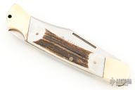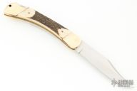This Puma Prince lockback features a satin finished blade with a single nail nick and notched thumbstud. The handle features a brass frame, stag scales and a steel backspacer. Includes the original box. Excellent Condition.