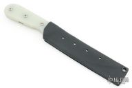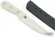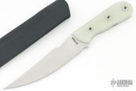 This Steak Knife by Mick Strider features a two-tone blade with false top edge and notched thumbrest, .139" blade stock and 1.038" blade depth, full tang construction. The handle has jade G-10 scales. Comes with a kydex sheath. "Blade 2023" on the tang. Excellent condition.