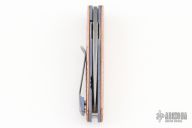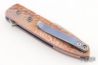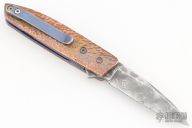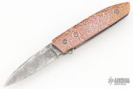 This Splinter by Tom Krein features a Chad Nichols SS Raindrop Damascus blade with swedge and flipper. The handle is comprised of hammered copper scales over scratch anodized titanium liners, copper backspacer and an orange peeled and anodized titanium tip up clip. Lanyard pin in pommel. Excellent condition.