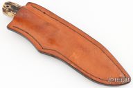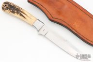 This knife by John Howser features a satin finished blade with false top edge, .195" blade stock and .970" blade depth, full tapered tang construction. The handle has dovetailed stainless steel bolsters, stag scales with red liners. Comes with a brown leather sheath. #400 on blade. Has some scratches, otherwise good condition.