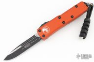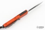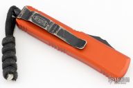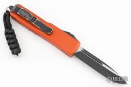 This UTX-85 by Microtech features a black finished blade. The handle has an orange aluminum frame with black hardware and tip down clip. Comes with original box and papers. Dated 03/2021 and s/n 62793. Has some scuffs, otherwise okay condition.