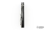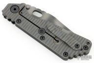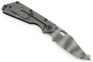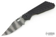 This Mick Strider SMF Bowie framelock folder features a tiger stripe blade with thumbhole and notched thumbrest. The handle has a black aluminum and flamed titanium frame with titanium clip, tip up carry, lockbar stabilizer. Jimping on blade spine. Nice lockup, detent, and blade seating. Has a couple light scuffs and scratches, otherwise excellent condition.