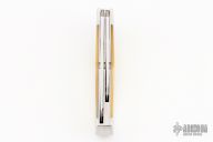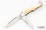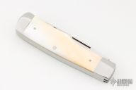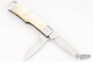 This Gunstock by R.E. Browne features two hand rubbed satin finished blades with nail nicks. The handle has dovetailed stainless steel bolsters, gold lip pearl covers, stainless steel liners and springs. Has half-stop, flush in all positions. Comes with a zipper case. Has some light scratches, otherwise excellent condition.