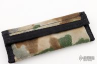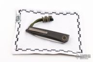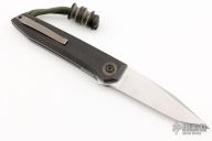 This PRIML flipper by Jared Oeser features a hand rub satin finished blade with a notched flipper. The handle has cross cut black Westinghouse micarta scales, bead blasted titanium frame, tip up clip and layered g10 backspacer with lanyard bail. Black micarta Scoopyloop attached. Nice detent, lockup and blade seating. Comes with original box, leather sheath, cloth and COA dated 9-2-21. Has some light scuffs and scratches on the blade, clip and frame otherwise great condition. Marked Protype 2 on the card.