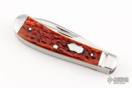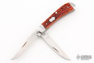 Case and Tony Bose collaboration in 2013. Two satin finished blades with half stops. Satin stainless pinched and fluted bolsters and chestnut jigged bone covers with stainless steel escutcheon. Very well made knife for a fraction of a custom Bose trapper. Comes with original box and zippered case. Has some light scuffs and scratches otherwise excellent condition.