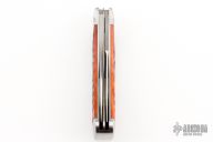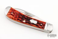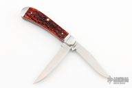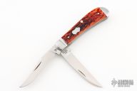 Case and Tony Bose collaboration in 2013. Two satin finished blades with half stops. Satin stainless pinched and fluted bolsters and chestnut jigged bone covers with stainless steel escutcheon. Very well made knife for a fraction of a custom Bose trapper. Comes with original zippered case. Has some light scuffs and scratches otherwise great condition.
