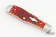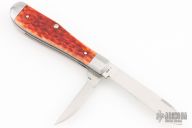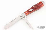 Case and Tony Bose collaboration in 2017. Two satin finished blades with half stops. Satin stainless pinched bolsters and chestnut jigged bone covers with stainless steel escutcheon. Very well made knife for a fraction of a custom Bose trapper. Comes with zippered case. Has some light scuffs and scratches otherwise great condition.
