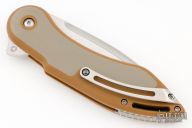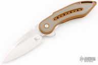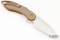 This Glimpse by SteelCraft and Todd Begg features a satin finished spear point blade with fullers and a flipper. The handle has a coyote G-10 frame with desert tan inlays, titanium backspacer and tip up clip. Rides on IKBS bearings, nice detent, lockup and blade seating. Includes the original box. Has a couple light scuffs, otherwise excellent condition.
