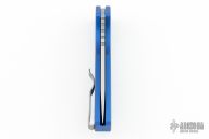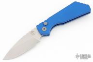 This Pro-Strider PT by Pro-Tech and Strider Knives features a tumbled finished blade with notched thumbrest. The handle has a blue aluminum frame with bead blasted hardware and black stainless steel tip up clip. Includes the original box and papers. Excellent Condition.