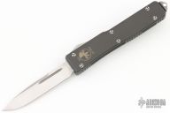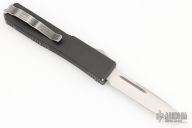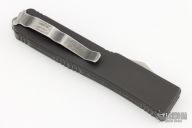 This UTX-70 OTF automatic by Microtech features a S/E satin finish blade with a standard edge. The handle has a black aluminum frame with blasted stainless steel tip down clip. Serial number 0441 and dated 05/2004. Has scuffs/scratches otherwise the knife is in good condition for its age.