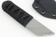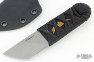 This Kiridashi by Ben Tendick of BRT Bladeworks features a tumbled blade.  .216" Blade Stock.  1.025" Blade Depth. The handle has a Japanese style wrapped handle over an epoxy soaked hemp under wrap.  Titanium bat menuki.   Includes kydex sheath and COA. New from Maker.