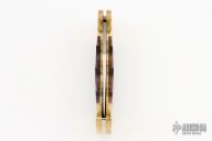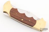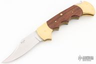 This lockback by Rigid Knives features a clip point satin finished blade with thumbstuds. The handle has a brass frame with wood inlays and a stainless steel backspacer. Nice lockup. Comes with original brown leather sheath and original box. Has some light scuffs and scratches, excellent condition otherwise.