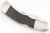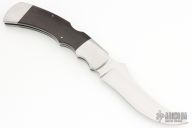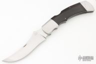 This lockback folder by Terry Davis features a hand rub satin finished blade with nail nick. The handle has green linen micarta scales, stainless bolsters front and rear with a stainless steel spring. Opens and closes with a nice snap. Nice lockup and function. Has scuffs and scratches throughout. Good condition otherwise.