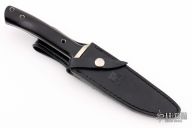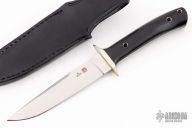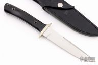 Shiva is the first tactical fixed blade Al Mar made with a laminated VG-10 stainless steel blade. Laminating the VG-10 between two layers of 400 series stainless steel increases the lateral strength of the blade by upwards of 30% and does so without increasing the weight or bulk. The Shiva has a beautiful tapered tang, contoured and polished black linen micarta scales, nickel silver guard. Comes with black leather sheath. Excellent condition.