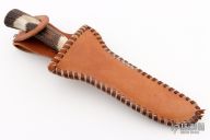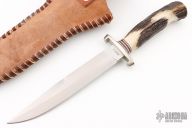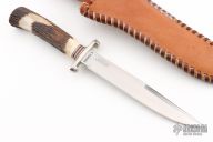 This Morseth Stag fighter has a satin finished clip point blade with hidden tang, .179" blade stock and 1.023" blade depth. Handle is stag antler with a nickel silver guard and black, white and red spacers. Comes with custom Morseth brown leather sheath with belt loop. Has some light scuffs and scratches, and verdigris, great condition otherwise.
