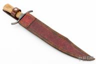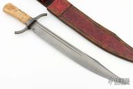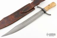This Bowie by Elijah Kelly features a Damascus blade made from 3440 layers of 15n20, 1096, and 5160 steels, has fullers and a nearly sharpened top edge, .182" blade stock and 1.700" blade depth, hidden tang construction. The handle has a Damascus guard and collar with a stabilized maple root grip and a copper spacer. Comes with a hand tooled brown leather sheath. Excellent condition. Sole Authorship