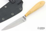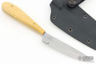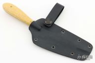 The belt Knife, by Mark Cucina, features an upswept drop point blade with a full tang construction. .081" Blade Stock .797" Blade Depth. The handle has yellow heart wood scales. Includes a kydex sheath. New from Maker!