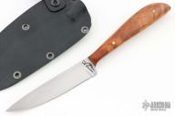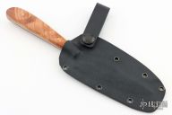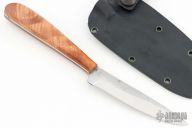 The belt Knife, by Grohmann Knives, features an upswept drop point blade with a notched thumb rest and a full tang construction. .062" Blade Stock .791" Blade Depth. The handle is composed of cherry wood scales. Includes a black kydex sheath.  New from maker!