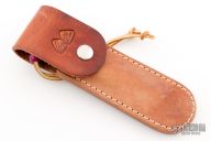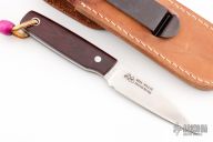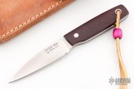 The Sport 400 by Mike Irie features a drop point style hand rub satin finished blade with a notched thumbrest and a full tang construction. 0.139" Blade Stock and .836" Blade Depth. The handle has micarta scales and a lanyard hole. Comes with a brown leather sheath. Marked "6 97" on the blade. Excellent condition.
