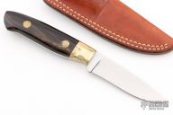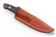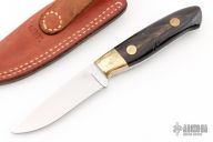 This drop point skinner features a satin polish finished blade with a full tapered tang construction, .153" blade stock and .627" blade depth. The handle has brass bolsters and pins, with horn scales. Comes with leather sheath. Has scuffs and scratches throughout, good condition otherwise.