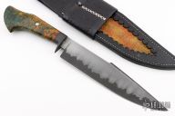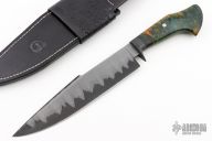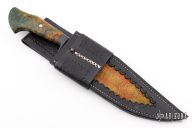 This Fighter by Abril Knives features a San Mai blade ( forged inox 420/1070) with false top edge, .187" blade stock and 1.948" blade depth, hidden tang construction. The handle has an iron guard, and stabilized maple burl wood grip with single mosaic pin. Comes with hand-tooled leather sheath and frog. Excellent work. New from maker!