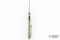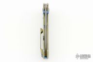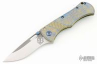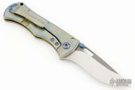 This Rostrum by John Gray features a satin/stonewash finished Magnacut blade with thumbstuds and thumbhole. The handle has a bark finished and anodized titanium frame with a textured titanium backspacer and tip up titanium clip. Has a stainless steel lockface insert and overtravel stop. Nice detent, lockup and blade seating. Excellent condition. Comes with a zippered case.