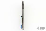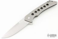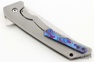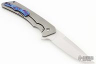 This R1 by Kevin Foster features a hand rub satin finished drop point blade with false top edge and flipper. The handle has a bead blasted titanium frame with mokuti tip up clip, bead blasted standoffs. Nice blade seating, detent and lockup, rides on bearings. Includes zippered case. Excellent condition.