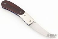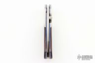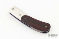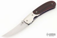 The knife has a hand rub satin finished blade with a single thumbstud. The handle has satin titanium bolsters, wood scales, anodized titanium liners and backspacer with lanyard pin. Has a few light scratches, otherwise excellent condition.